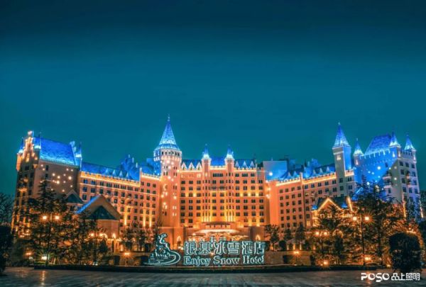 銀基冰雪酒店坐落于鄭州銀基國(guó)際旅游度假區(qū)的中心位置, 緊鄰銀基動(dòng)物王國(guó),是目前中原地區(qū)最大、配置最豐富的親子度假酒店。酒店由世界知名的建筑設(shè)計(jì)公司W(wǎng)ATG設(shè)計(jì),總建筑面積達(dá)161,800平方米,擁有1314間主題客房。酒店猶如一座冰雪城堡,以雪花元素貫穿各個(gè)場(chǎng)所,充滿夢(mèng)幻童趣,眾多寒帶動(dòng)物雕塑及冰雪裝飾品與建筑主體相輔相成,待夜間燈光亮起,整座宮殿更添一番神秘,引人浮想聯(lián)翩。