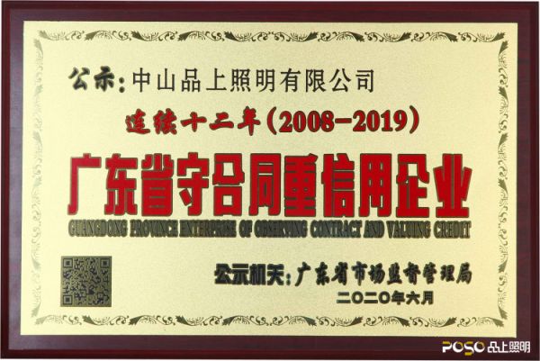 “2019年度廣東省守合同重信用企業(yè)”評審結(jié)果已陸續(xù)公布,品上照明順利通過廣東省市場監(jiān)督管理局的最終評審,再度榮獲該項(xiàng)殊榮,截止目前,品上照明已連續(xù)十二年獲評該項(xiàng)榮譽(yù)稱號。