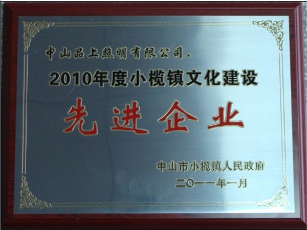 品上照明被中山市小欖鎮(zhèn)人民鎮(zhèn)府評為2010年度小欖鎮(zhèn)文化建設(shè)先進企業(yè)。