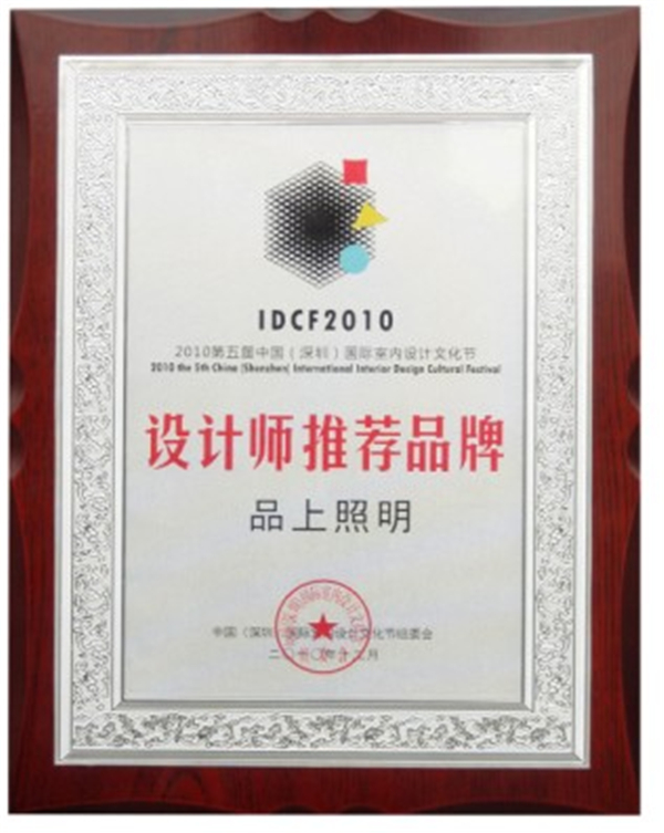 我司憑借近幾年在行業(yè)內(nèi)的努力與良好的口碑再次獲得“設(shè)計(jì)師推薦品牌”的稱號,這是我司品牌在國內(nèi)設(shè)計(jì)領(lǐng)域的又一次肯定與提升,第五屆中國(深圳)國際室內(nèi)設(shè)計(jì)文化節(jié)的巨大影響力為品上照明2011年設(shè)計(jì)師隱形渠道建設(shè)打下了良好基礎(chǔ)。