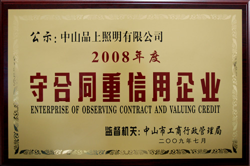 近日,廣東省中山市工商行政管理局授予品上照明“2008年度守合同重信用企業(yè)”稱(chēng)號(hào),以表彰我司一直以來(lái)的誠(chéng)信經(jīng)營(yíng)。