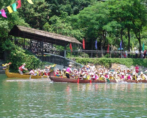 旅游的第一個(gè)項(xiàng)目是劃龍舟比賽,大家踴躍參與、表現(xiàn)英勇,加油聲、吶喊聲和號(hào)子聲混成一片,濺的滿(mǎn)身水珠是我們努力的最好見(jiàn)證。冠軍隊(duì)是以行政部和物料部員工為主的8號(hào)車(chē)。因?yàn)榫皡^(qū)比較大,龍舟賽后大家就三五一群地自由行動(dòng)了。毒辣的太陽(yáng)仍然不能阻擋大家游玩的興致,很多帶了家屬的員工此刻更是難得的愜意。