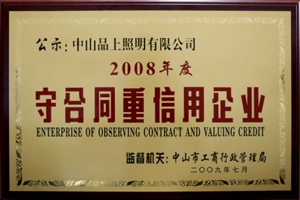 圖/榮譽(yù)證書 近日,廣東省中山市工商行政管理局授予品上照明“2008年度守合同重信用企業(yè)”稱號,以表彰我司一直以來的誠信經(jīng)營。 守合同、重信用是一家企業(yè)實(shí)力和素質(zhì)的體現(xiàn)。品上照明在成立之日起,就十分重視誠信文化的建設(shè),特別注重員工職業(yè)道德教育,強(qiáng)化職業(yè)文明和信用意識。在經(jīng)營活動中恪守合…